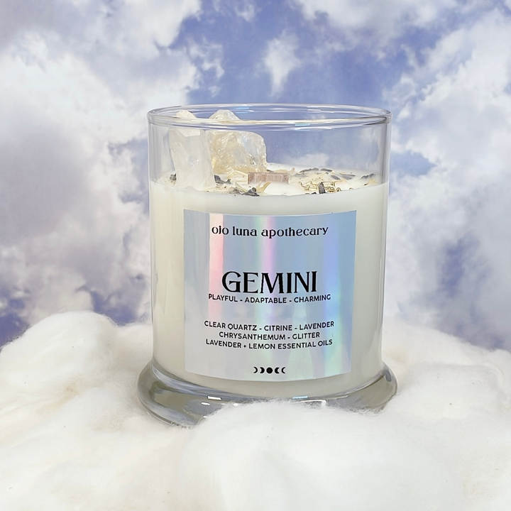 Gemini: Gemini is the sign of duality. This candle represents all that Gemini is - mystical, clever and playful. Scented with heavenly florals of lavender and lemon brushed with a hint of chrysanthemum. With Clear Quartz and Citrine Crystals charged under the Full Moon.