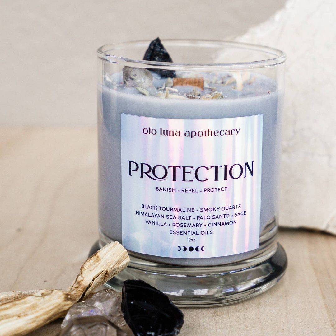 Protection: This candle creates a space for protection against negative energy. It is a protective guard, deflects negativity, creates safety, grounding and recharging of strength.Garnished with palo santo, sage, Himalayan sea salt, black tourmaline and smoky quartz crystals that have been charged under the full moon and filled with the intent to protect and create a safe environment.