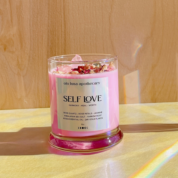 Self Love: This candle is designed to help you raise your heart's vibrational frequency and begin manifesting the Love And Confidence you deserve. It is infused with the power of Roses and other magical ingredients that will help you radiate with Self Love and Confidence. Includes an affirmation card to be read every time the candle is lit.