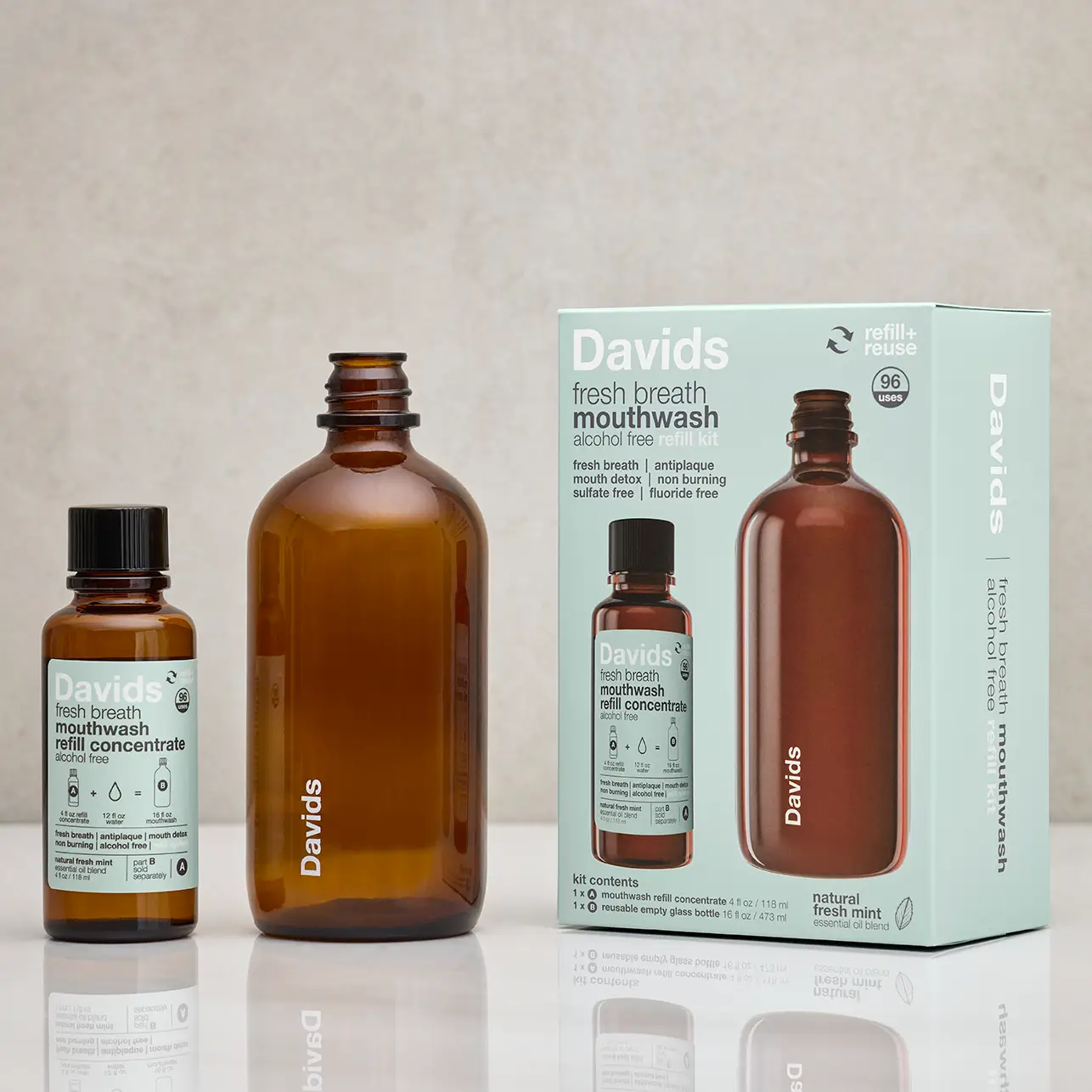 refill kit contains: 1 x mouthwash refill concentrate 4oz 1 x reusable empty glass bottle 16oz