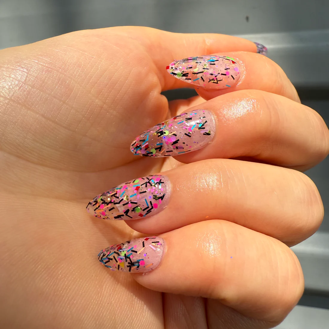Sheer base with a variety of neon glitter shapes and shards paired with stark black bars. The clash of color and shape gives this polish an offbeat, almost collage-like effect. Playful and over the top. It’s a shade that feels like Friday night at the skate rink when you discovered how to fly on rollerblades. Or, strangely, cats. Chaotic cats.