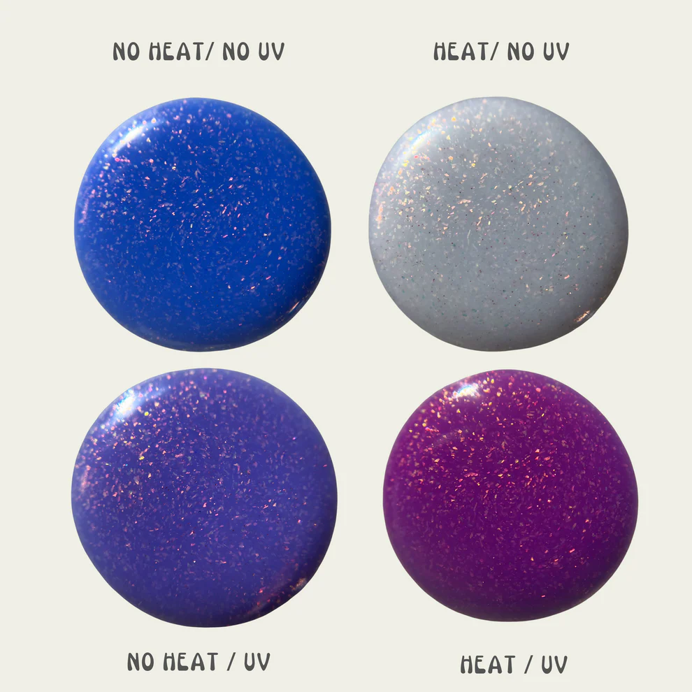 This polish will produce a unique color reaction to the presence or absence of direct sunlight (not through a window) and temperature change. The variances of color are: no UV's in a cold state/no UV's in a hot state and UV's in a cold state/UV's in a hot state. There is a range of color varieties based on temperature and UV rays.