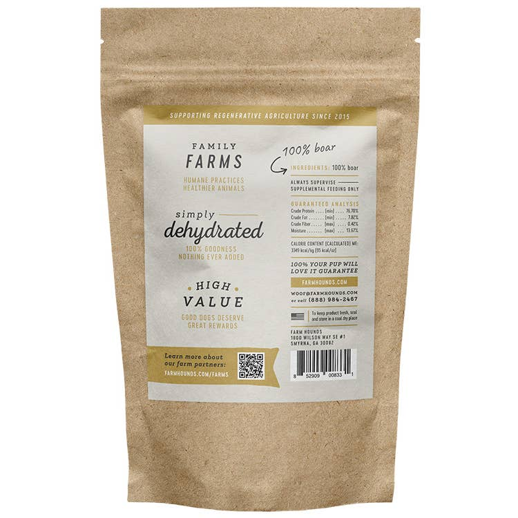 - Only the good stuff: Every bag is 100% boar that is transparently sourced from family farms! With the power of dehydration, we offer your pups treats that are free of salt, sugar, fillers, chemicals, and preservatives!