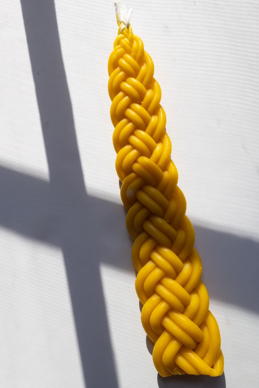 Beeswax Havdalah Candle - Braided Candle - Jewish Ritual Candle - Jewish Wedding Gift 8-wick braided candle. Approximately 12 inches long. Traditionally used to mark the end of the Jewish sabbath, these hand-braided candles can be used for your own ritual, or simply burned like a torch, for a powerful glow. A lovely gift for a Jewish wedding.