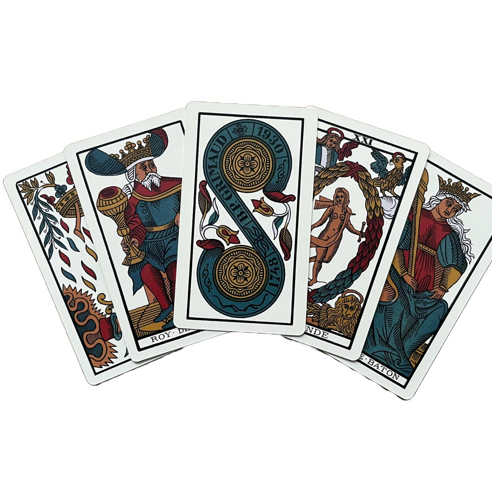 B.P Grimaud of Paris first printed this version of the Tarot de Marseille in 1930 only to be discontinued shortly after due to the start of World War II. Few examples of original decks exist, and those that do are often in poor shape. I've found, restored, and reprinted one of these elusive decks in the hopes that history will be kinder to these beautiful, historic decks this time around.
