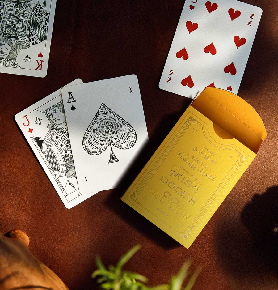Manufactured by the United States Playing Card Company in Erlanger, KY using sustainable BEE paper stock and vegetable-based inks. The cards are coated with an air-cushion finish for easy handling and long life. Every design is original and every element illustrated by hand. This deck is a balance of utility and art.