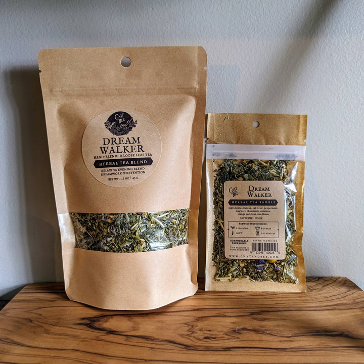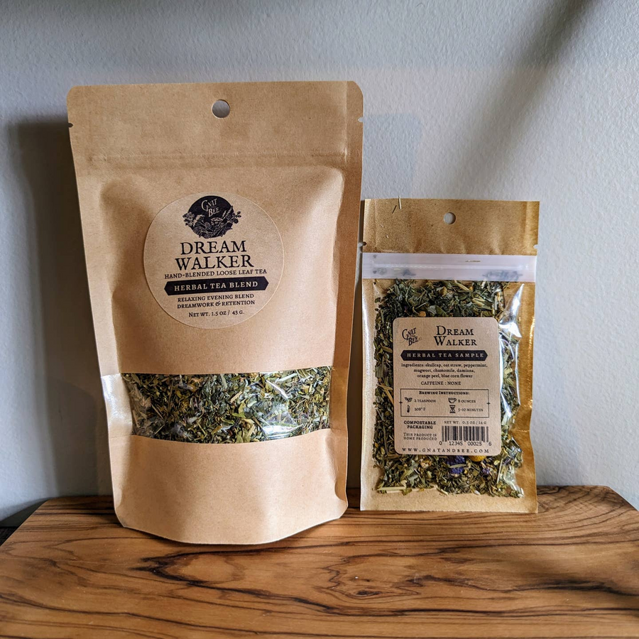 Dreamwalker: Skullcap, oat straw, peppermint, mugwort, chamomile, damiana, orange peel and blue corn flower * Caffeine Free * Flavor: Refreshing minty start with an earthy floral finish