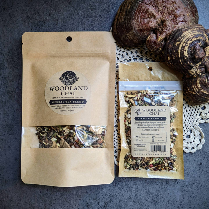 Woodland Chai: Rosehips, cinnamon, roasted carob, ashwagandha root, ginger, Indian sarsaparilla root, Western cedar tips, roasted chicory root, reishi mushroom, allspice, pink peppercorn * Caffeine Free * Flavor: Deep, spicy and earthy, balanced with fruit, and a hint of pine.